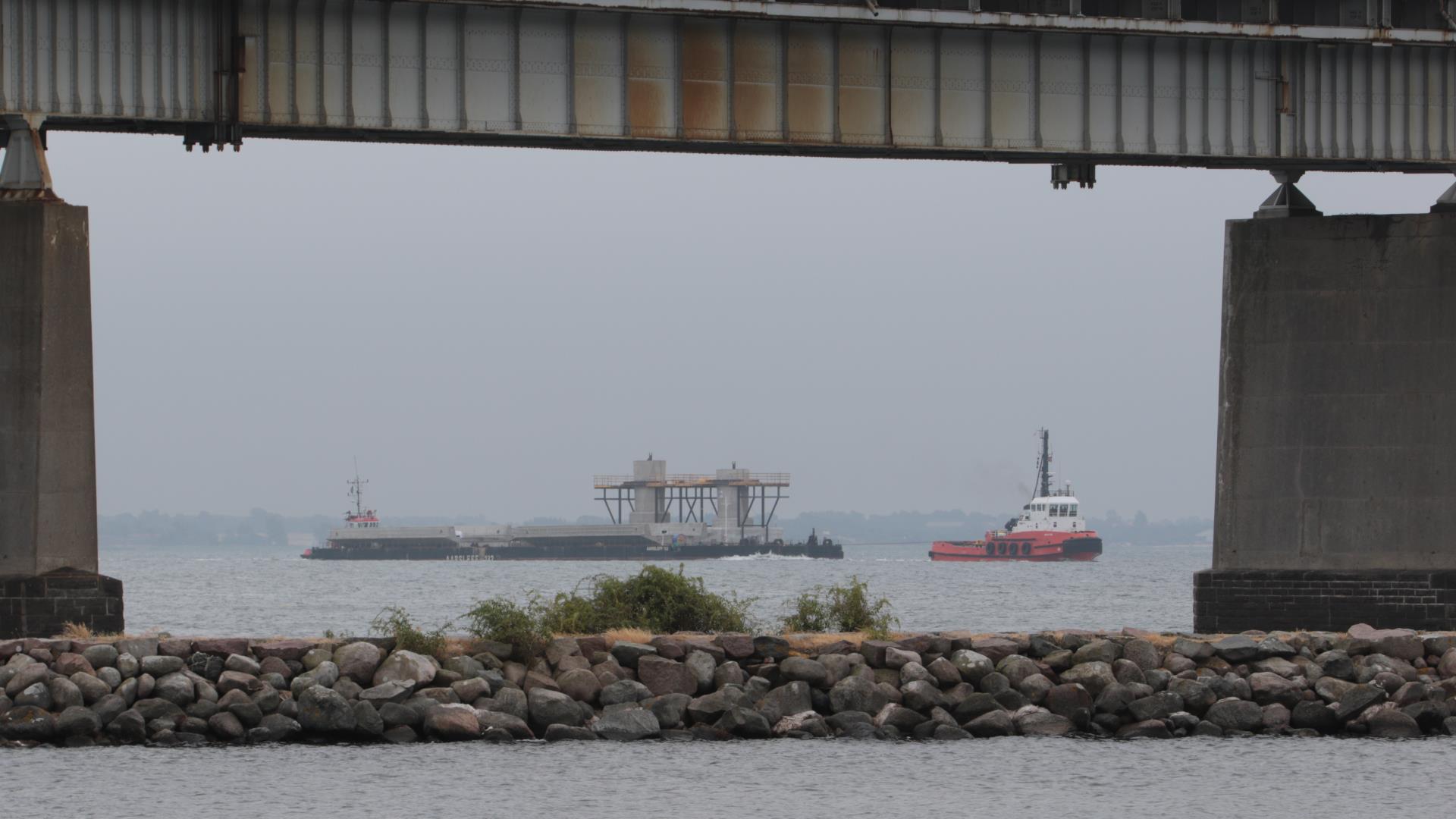 I weekenden ankom den anden af to flydepramme med elementer til den nye jernbanebro over Masnedsund fra Polen. En nabo til byggeriet har sendt os dette billede af prammen set under Storstrømsbroen.