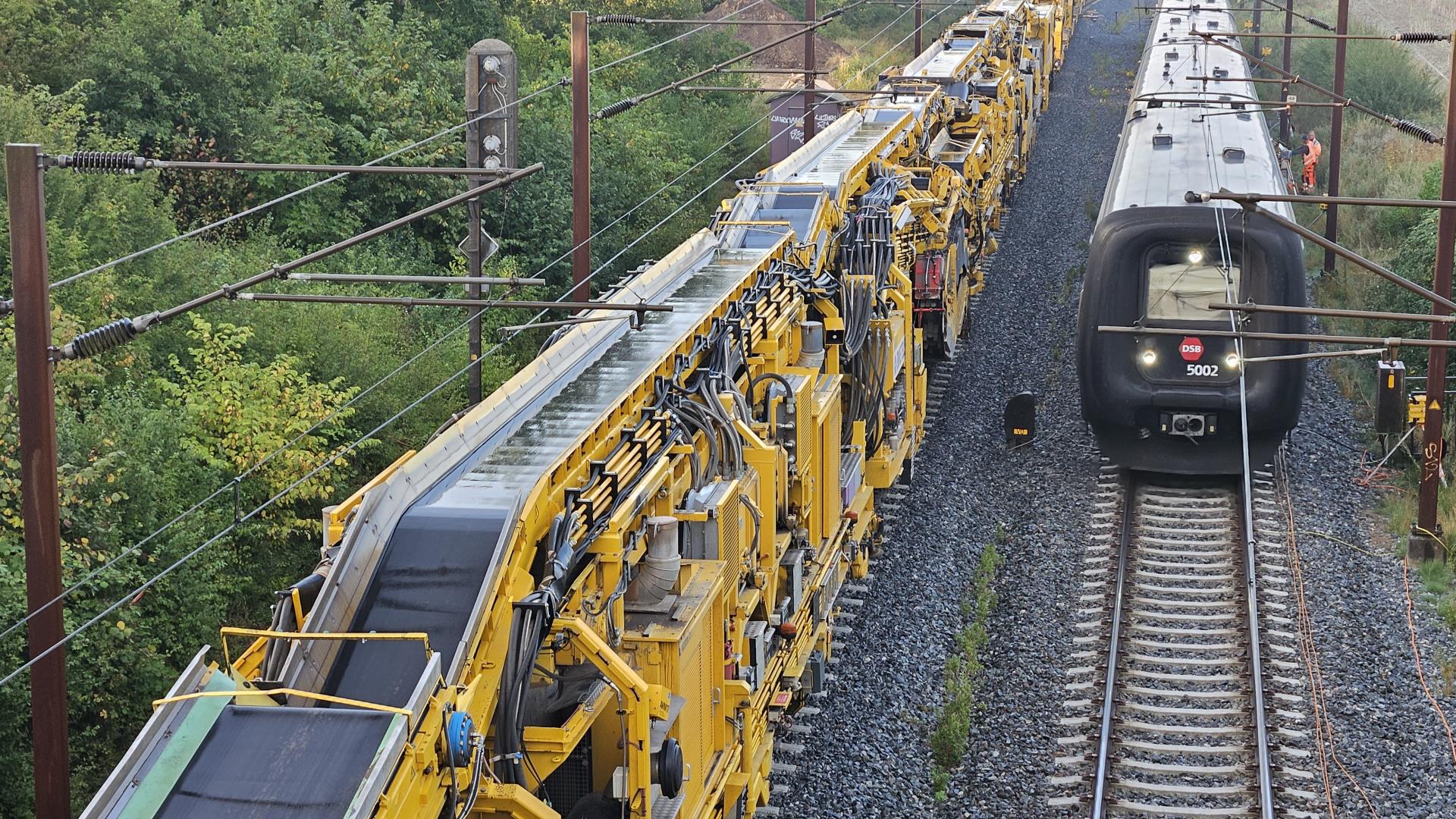 To jernbanespor, hvor en gul sporombygningsmaskine arbejder i venstre spor, mens et DSB IC-3 tog passerer i højre spor.