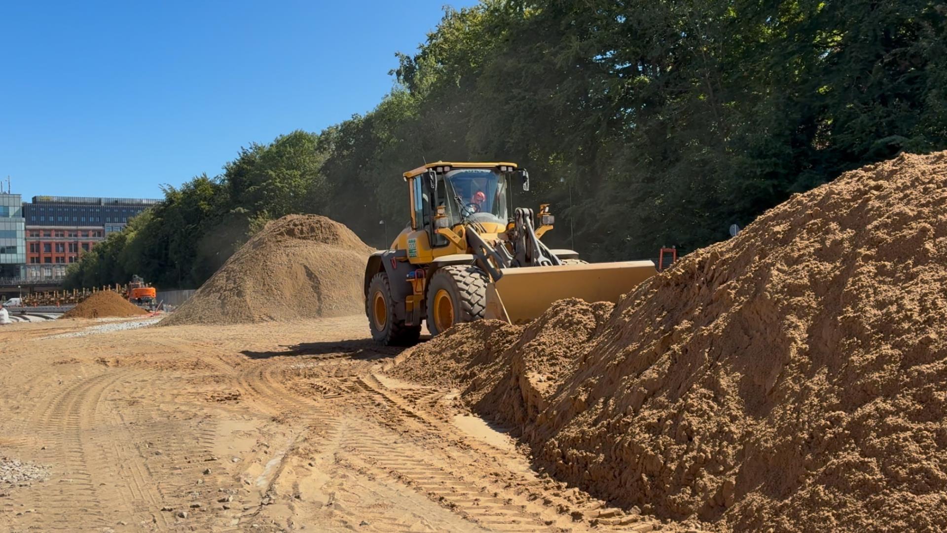 Lige nu er vi i gang med at støbe et solidt fundament til pladsens store kran, som ankommer senere i efteråret. Samtidig er vi i gang med at forberede solide køreveje på pladsen til dumpere, grave- og øvrige anlægsmaskiner.