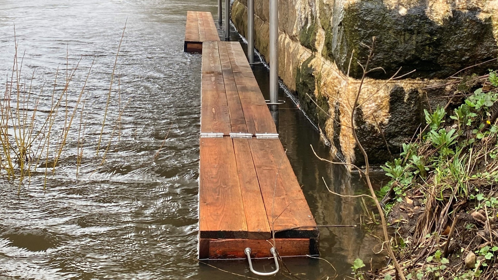 Den flydende passage er 10 meter lang. Her kan odderne trygt bevæge sig under togbroen. Og selv hvis vandstanden skulle stige, er det stadig muligt at bruge passagen, da den er lavet af flydepontoner.
