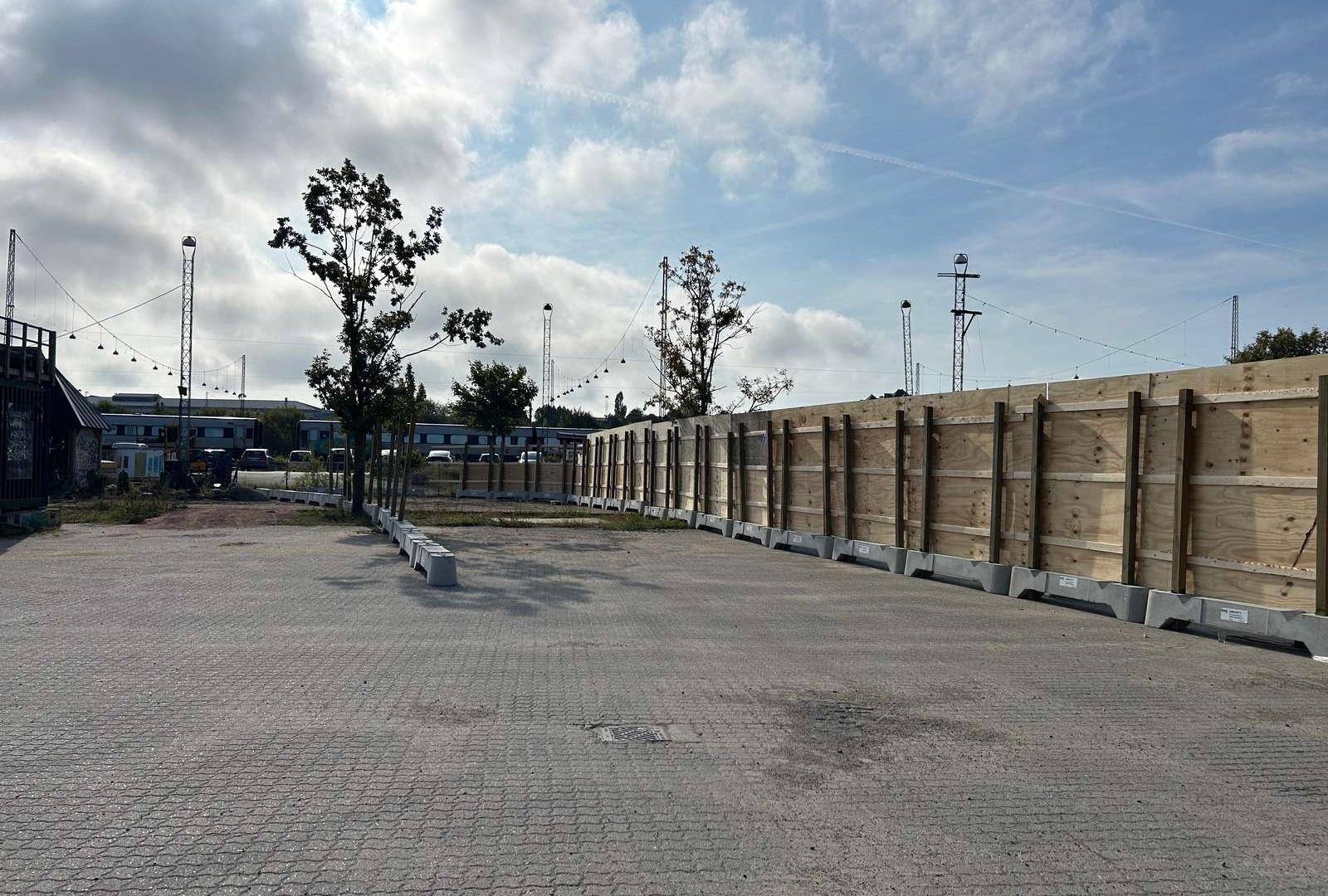 Adgangsvejen er nødvendig for at udføre arbejdet på banen og er afskærmet med betonklodser og pladehegn, for at de store anlægsmaskiner ikke kommer i kontakt med pladsens brugere, cyklister og gående.