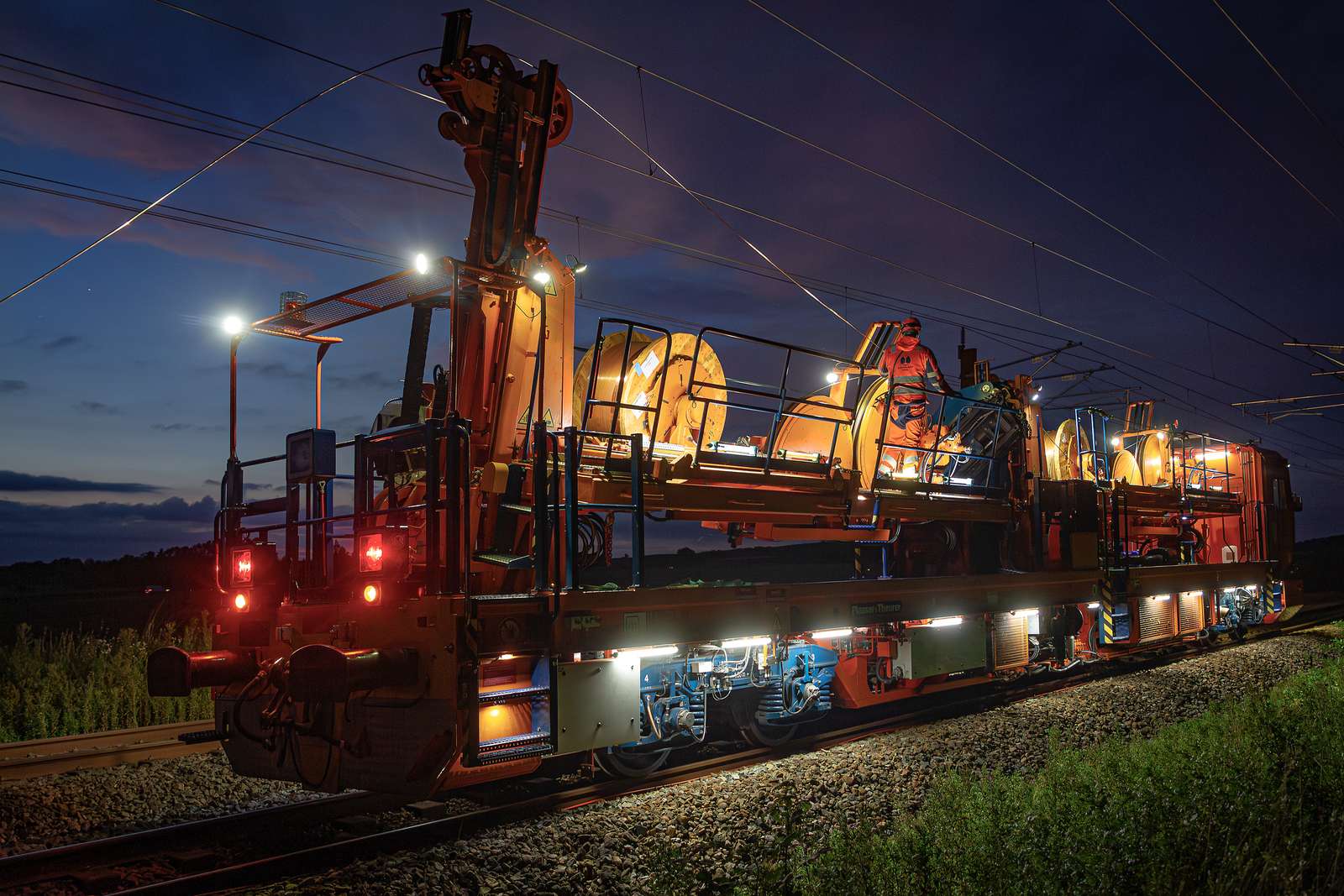 ”I øjeblikket er vi ved at hænge køretråd op på den sydlige strækning fra Fredericia til Aarhus, og så er strækningen stort set færdig. Men det har været en lang vej at nå hertil. Forinden har vi bl.a. foretaget tusindvis af prøvesugninger langs banen, vi har opført seks helt nye transformerstationer, og vi har nedrammet betonfundamenter og opsat kørestrømsmaster for hver 60-80 meter på hele den 108 km lange delstrækning,” forklarer Claus Christensen.
