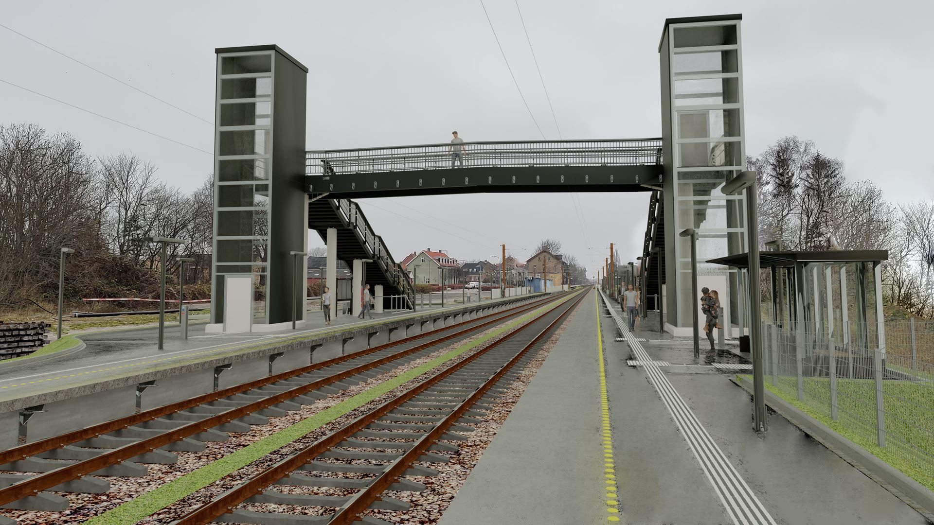 Entreprenøren har etableret byggeplads, og 27. marts går arbejdet på perron og spor ud mod Skernevej i gang. Skernevej lukkes for gennemkørsel 26.03.2021.