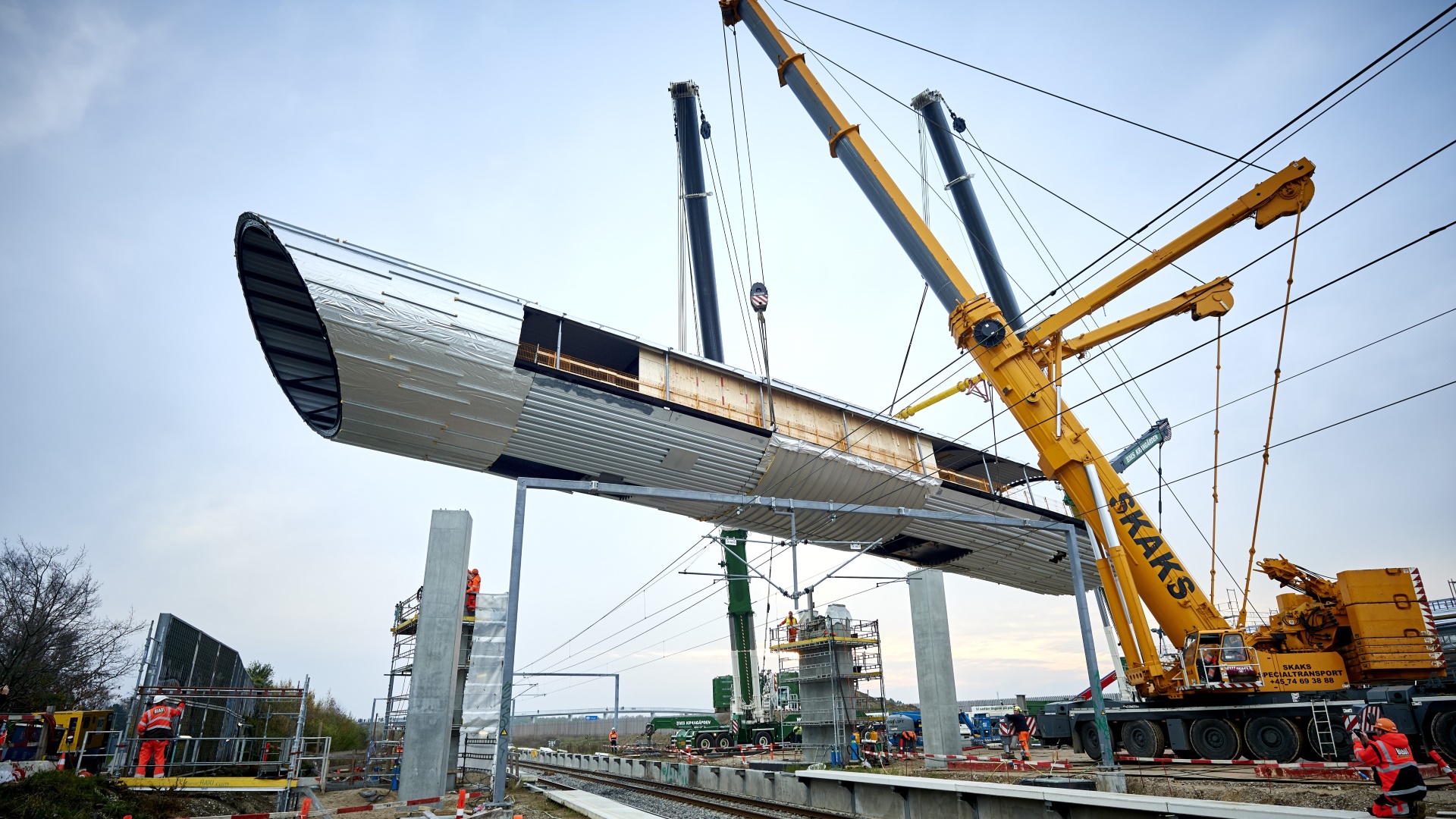 Montagen af de i alt seks elementer til den 225 meter lange gangbro, er delt op i flere etaper. Det første element blev monteret henover S-banen i starten af november, og de næste to elementer løftes på plads henover Køge Bugt Motorvejens nordgående spor i den kommende weekend.