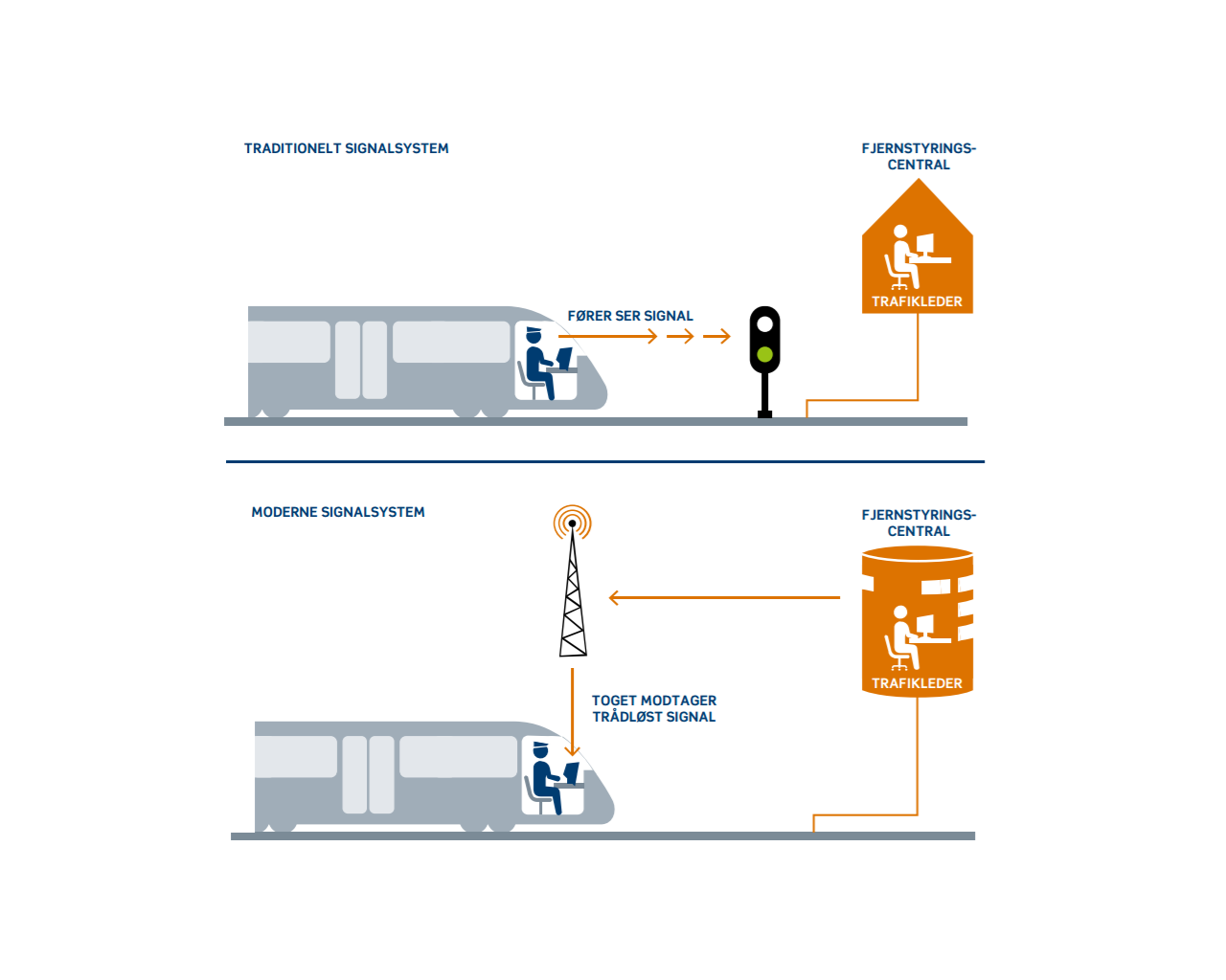 Med det nye signalsystem modtager lokomotivføreren køresignalet direkte på en skærm i førerrummet via radiokommunikation. Det betyder, at de signaler, der i dag står langs jernbanen, i fremtiden fjernes.